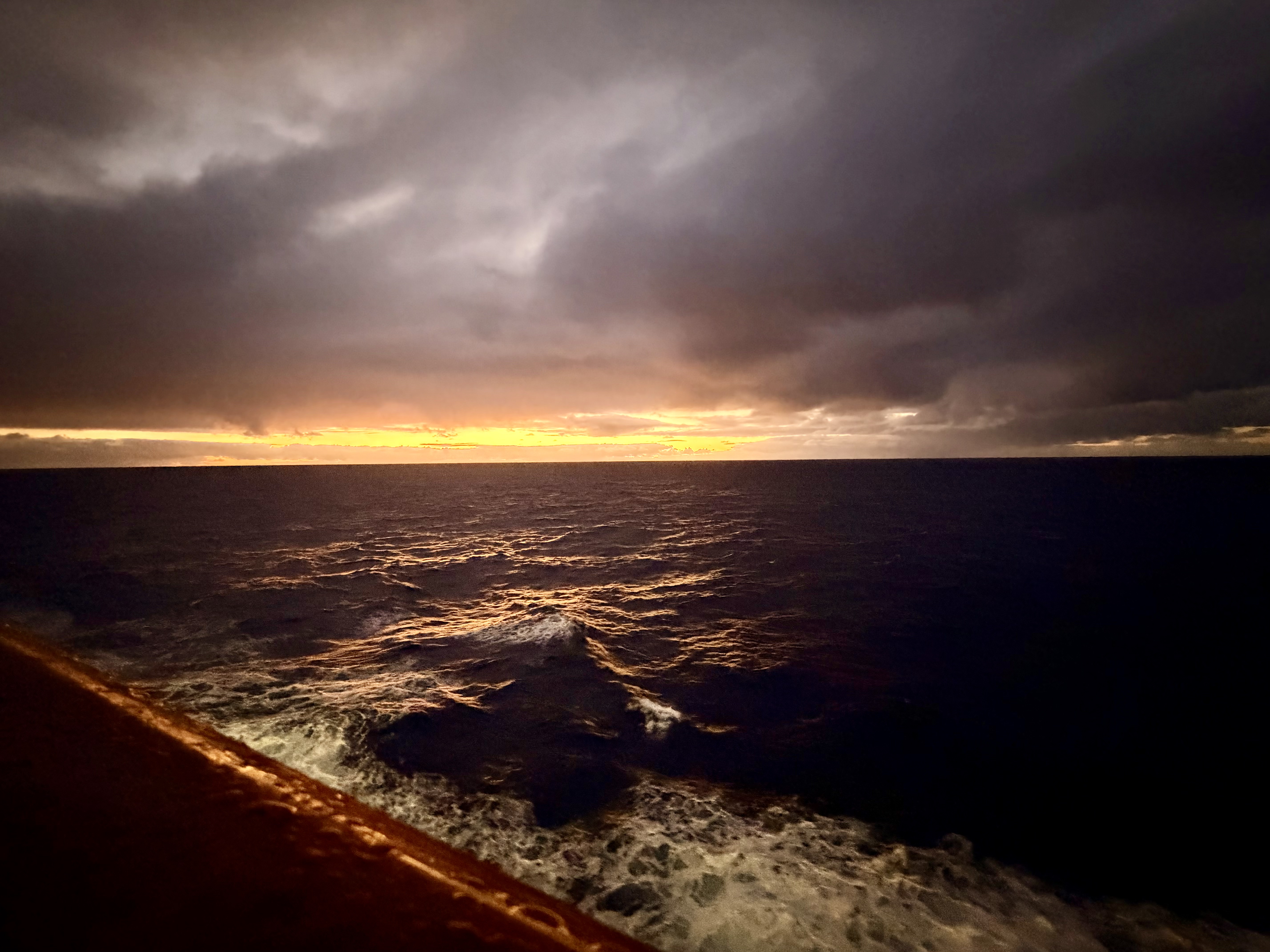 With less than 300 nautical miles remaining before we reach our destination, my perspective of sea days has evolved. Every dawn, every sunset is a unique mingling of clouds, shadows and sunlight. The way the light bounces, and plays with the water is fluid and enchanting. The fresh smell of salty air, the stark, void of bird song, the steady crash of waves against the hull, as the ship slices through the water. Here, on my veranda I have reconnected with wonderment. Its’ quietude has seeped back into my soul, opening my eyes to gratitude. In this awareness I realize that I have embraced the comforting rhythm of the day, one swell at a time.